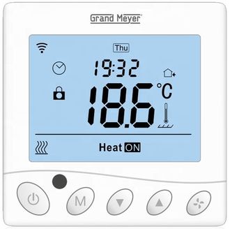 Grand Meyer W350 Wi-Fi, программируемый терморегулятор с функцией удаленного доступа Wi-Fi для управления отоплением электрического типа. Возможность программируемого, а также ручного управления. Возможность установки недельного периода 5+2/6+1/7 дней. Максимальная нагрузка 3600 W. Установка в стандартную монтажную коробку. Память настроек при отключении питания. Огнезащитный пластик. NTC датчик. Диапазон установки: от +5°C до +35°C (заводские).